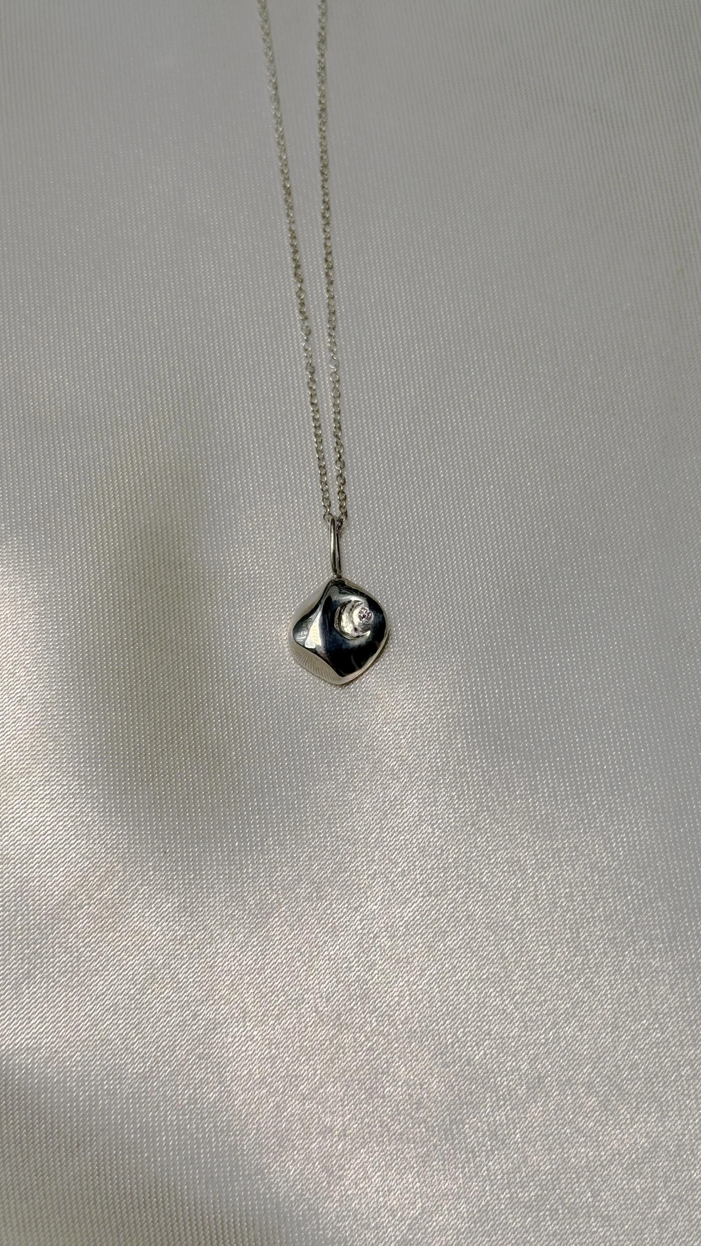A delicate silver necklace with a circular pendant featuring small engraved stones, placed on a shiny white satin fabric with green plant leaves nearby.
